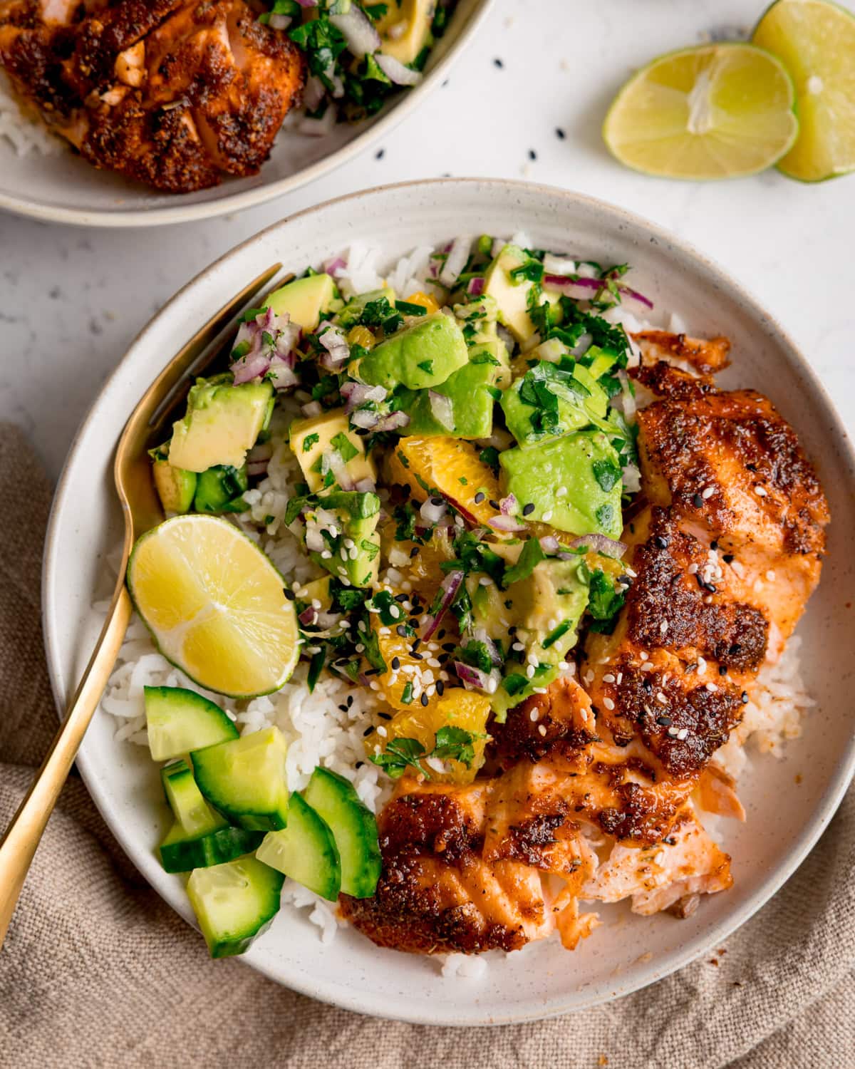 A salmon bowl with spiced air fryer salmon over white rice, topped with avocado orange salsa, cucumber pieces, coriander, and lime wedges.