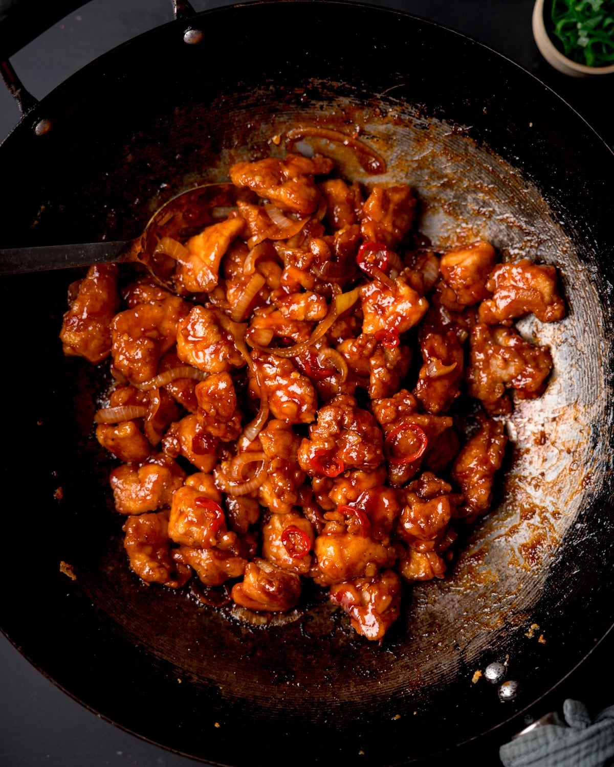 Crispy chunks of chicken, coated in a glossy, sticky sauce that’s sweet, a little bit spicy, and completely moreish!