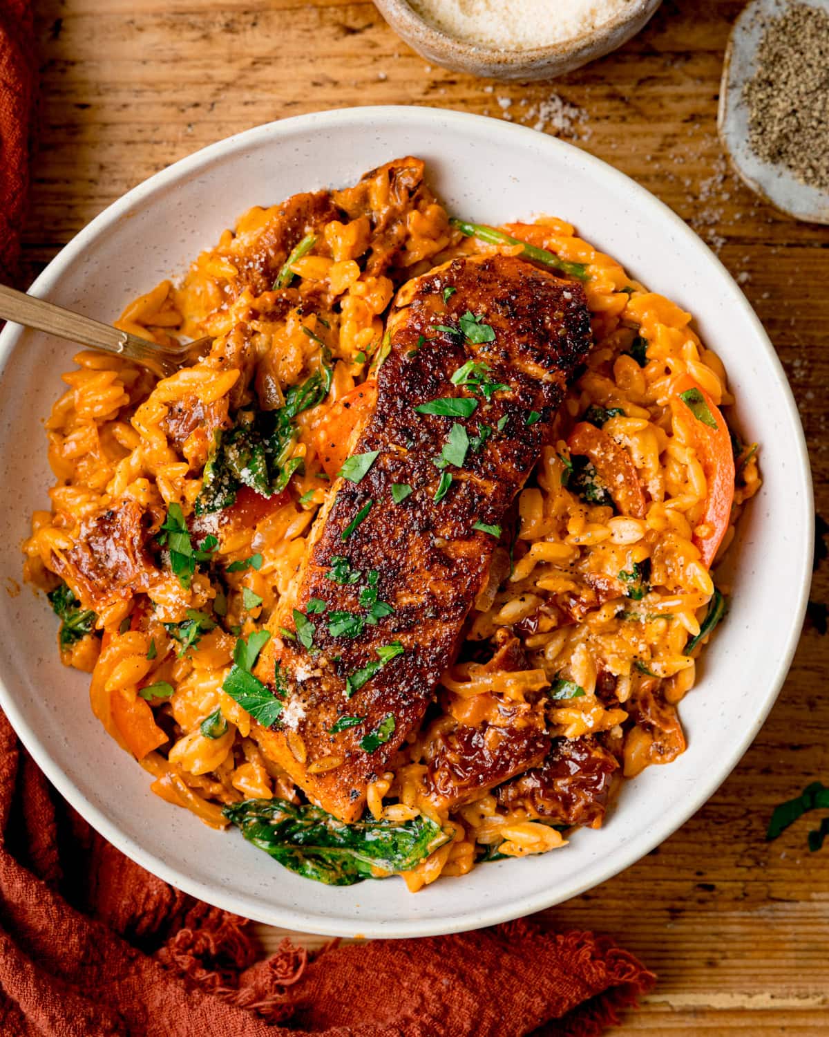Juicy seared salmon fillets with a beautiful seasoned blackened topping served nestled in a bed of perfect al dente creamy-tomato-parmesan orzo.